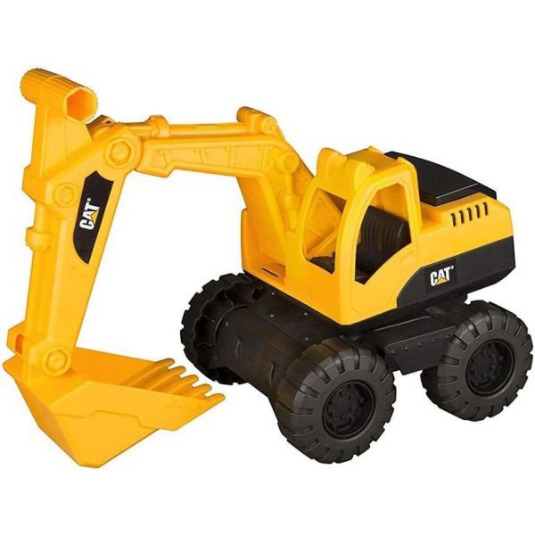 Excavadora de la marca CAT, diseñado para niños pequeños. Modelo: Parte de la línea "CAT Tough Rigs" o "Construction Fleet". Cuenta con ruedas de giro libre y un brazo y cucharón articulados manualmente. Está fabricado en plástico resistente duradero. Apto para jugar tanto en interiores como en exteriores, como en cajas de arena.