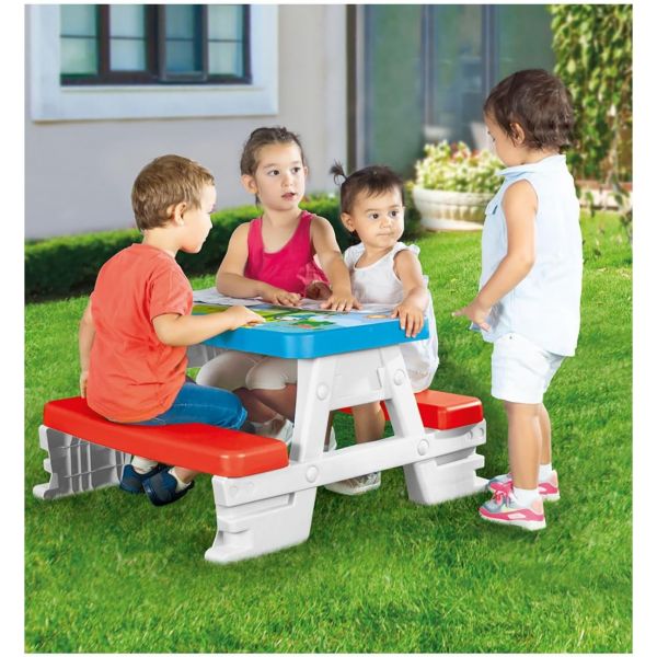 - Las dimensiones del banco de picnic son ideales para niños: altura 43 cm, longitud 77 cm, ancho 71 cm.